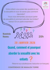 L'ikastola Arrokagarai organise une conférence avec Maialen Torre le mardi 20 janvier 2026 à 20h00 à l'ikastola sur le thème "Quand, comment et pourquoi aborder la sexualité avec les enfants ? Réservé aux adultes et ouvert à tous. Traduction en français.