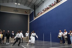 Une image du temps officiel qui se termine avec l’aurresku par les danseurs et musiciens d’Itsasu, devant les intervenants, de gauche à droite : Itsaso et Idoia adjointe et maire d’Etxauri (Navarre) en cours de jumelage avec Itxassou, Gillen Hiribarren bertsulari et conseiller municipal d’Itsasu, Lilou Echeverria de la fédération de pelote basque, JR Etchegaray président CAPB, Isabelle Pargade représente ici le conseil départemental, Mathieu Duhamel sous-préfet de Bayonne, Nicole Etchamendi (première adjointe Itsasu) et Mizel Hiribarren, (maire Itsasu) qui ont porté ensemble la prise de parole de la mairie.