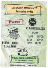 La librairie itinérante Menta est de nouveau sur les routes ! Voilà les dates des prochains passages à Itxassou, toujours une semaine sur deux, le mercredi après-midi de 14h30 à 18h30, à Balaki :