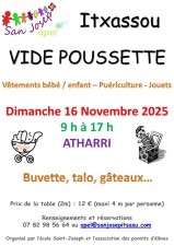 L'Ecole Saint Joseph et l'Association des parents d'élèves organisent un vide poussette le dimanche 16 novembre 2025 de 9h à 17h au mur à gauche Atharri.